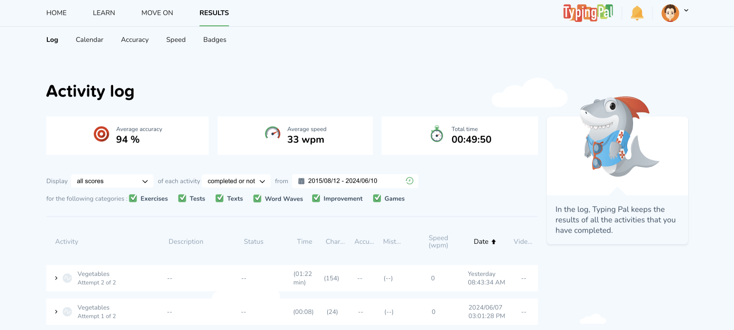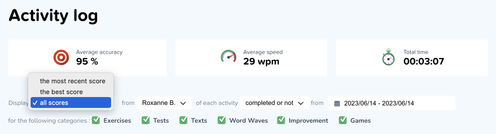 Filter your activities by checking or unchecking the boxes Exercises, Tests, Texts, Word Waves, Improvement and Games, and by choosing from the drop-down menu whether to show all exercises, including those you have not completed, or to show only completed exercises. By selecting a date range from the calendar menu, you can also filter activities by date.