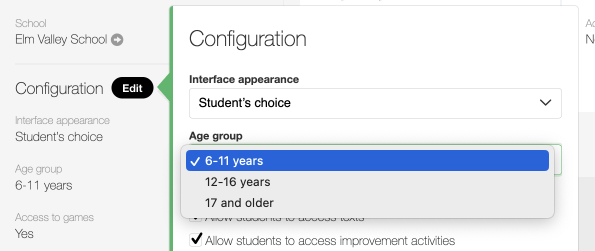 Select your students’ age group by going to the Configuration panel of the Group summary.