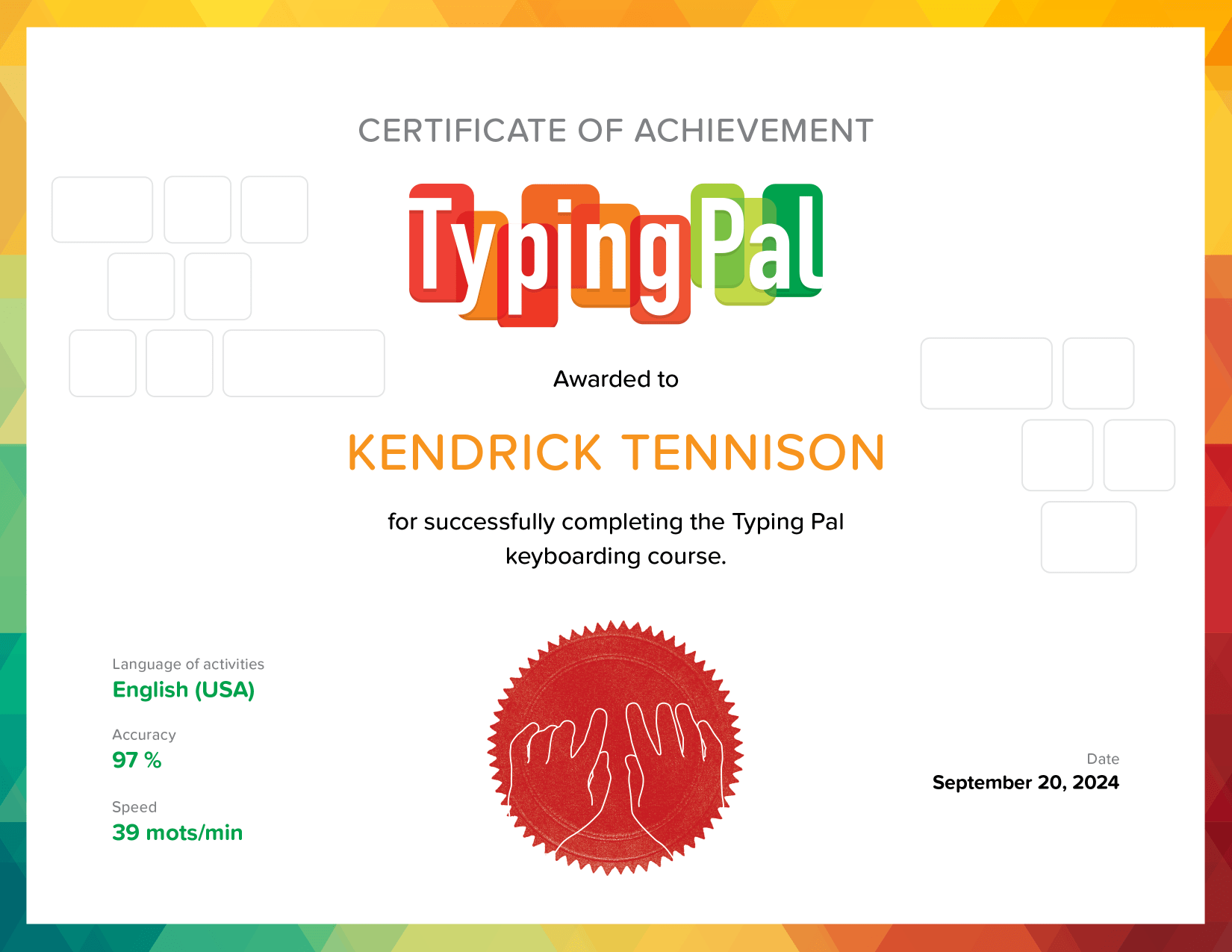 When you pass the final test, Typing Pal automatically generates a personalized certificate of achievement that displays your final speed and accuracy score.