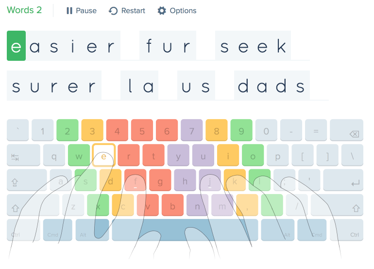 | The entertaining animations change according to the keys that are typed, the errors and the final result. | When an error is detected, fingers appear above the keyboard showing the finger that should be used to hit the correct key. |