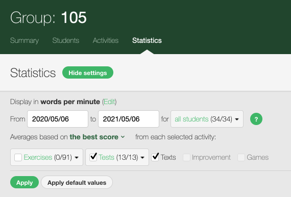 - Finally, filter the data by checking the relevant activities and unchecking the rest, and then click Apply (for a group) or Export (for a school)