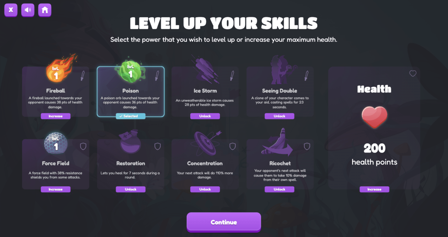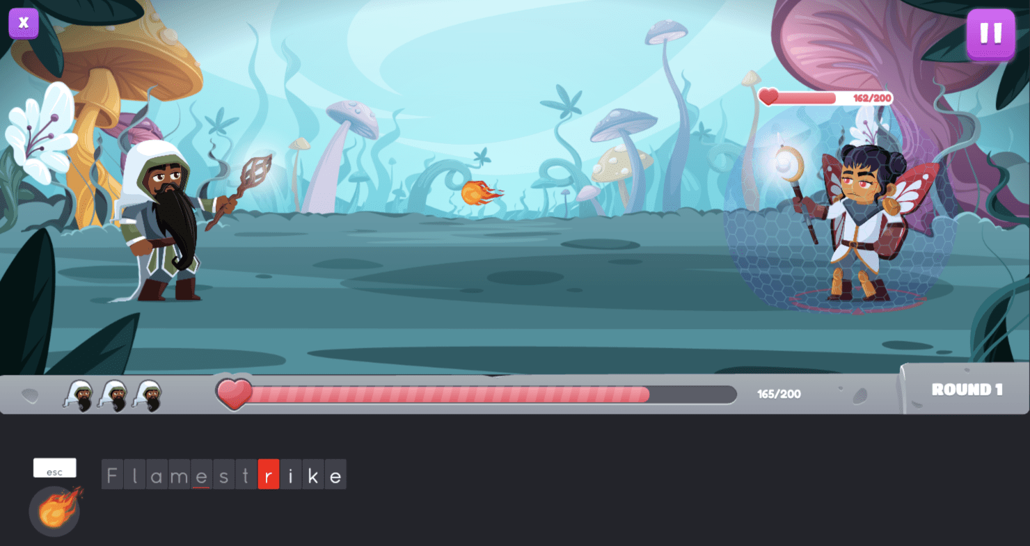 Practice by using the entire keyboard to type and cast eight different kinds of spells. You can choose one spell type to level up at the end of each round, after you’ve defeated your opponent. You'll have to be strategic in your spellcasting, though. As spells increase in power, they also become longer to type!