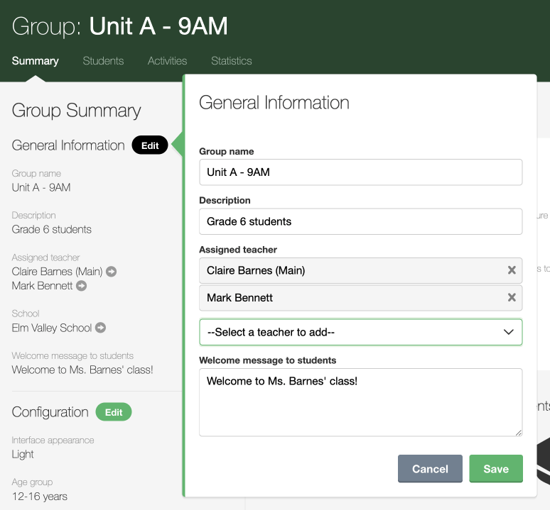 - Assigned teacher — The teacher accounts assigned management privileges for the group