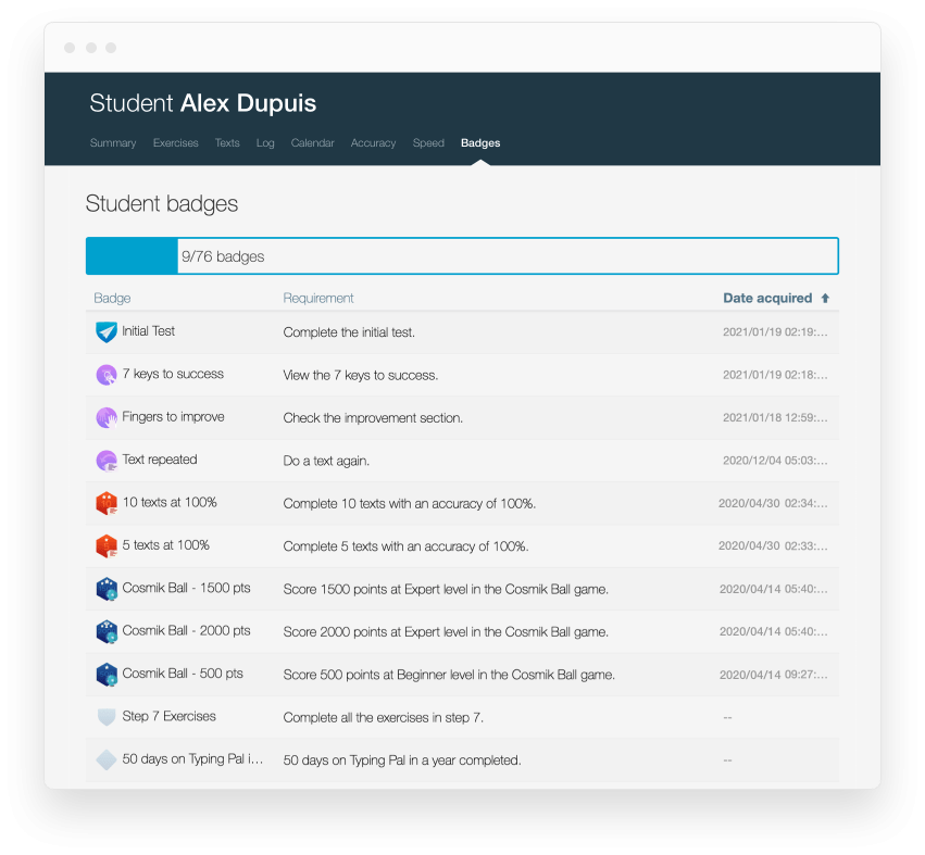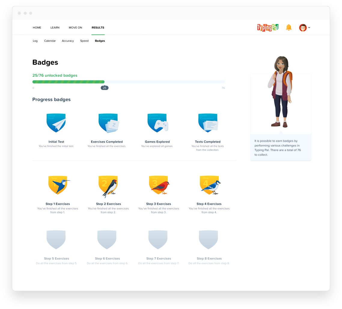 Who doesn’t like collecting badges? Thankfully, Typing Pal has lots of them! They’re divided into four categories and are awarded for progress as well as for particular achievements, making them a fun and effective way to set new goals at home or rekindle students’ interest at school.