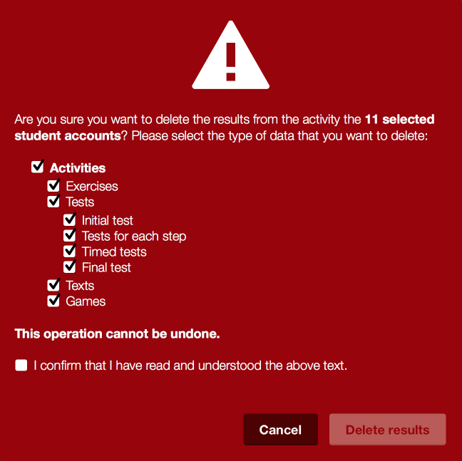Your students’ results are invaluable. However, in some cases, it may be useful to selectively delete them. For example, you may want to delete the results of certain activities you want students to start over or reset the final test so students can retake it in a supervised school environment.