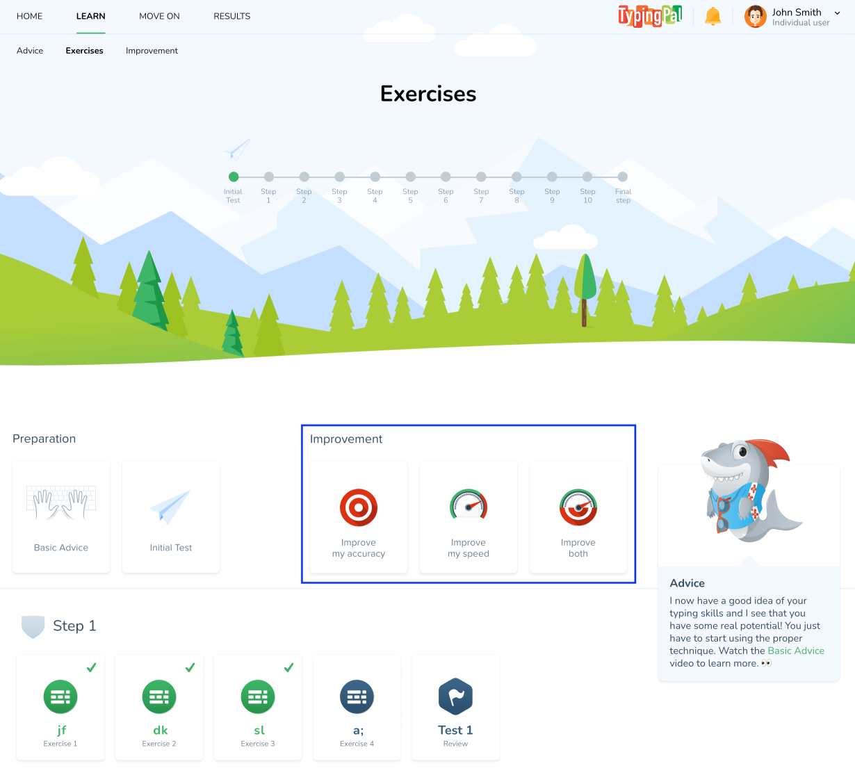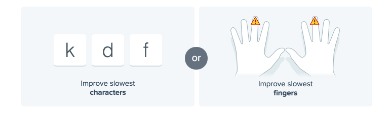 The improvement activities are automatically generated by Typing Pal’s algorithm, which analyzes the student’s typing and detects which characters or fingers need more practice.