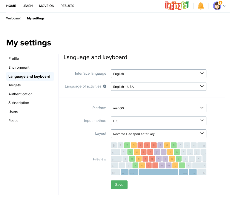 Your Typing Pal subscription gives you full access to both English and French typing programs. The language of activities is associated with its own training program that records your progress. You can therefore change the language of activities at any time without losing the progress associated with it.