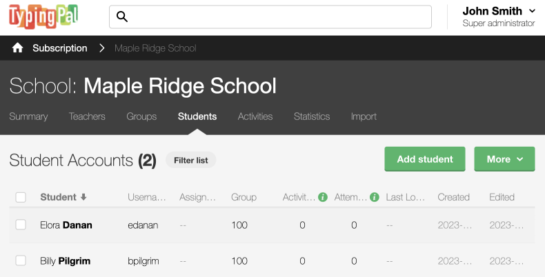 - Add — Create a school, teacher, group or student by entering the details manually in a form.