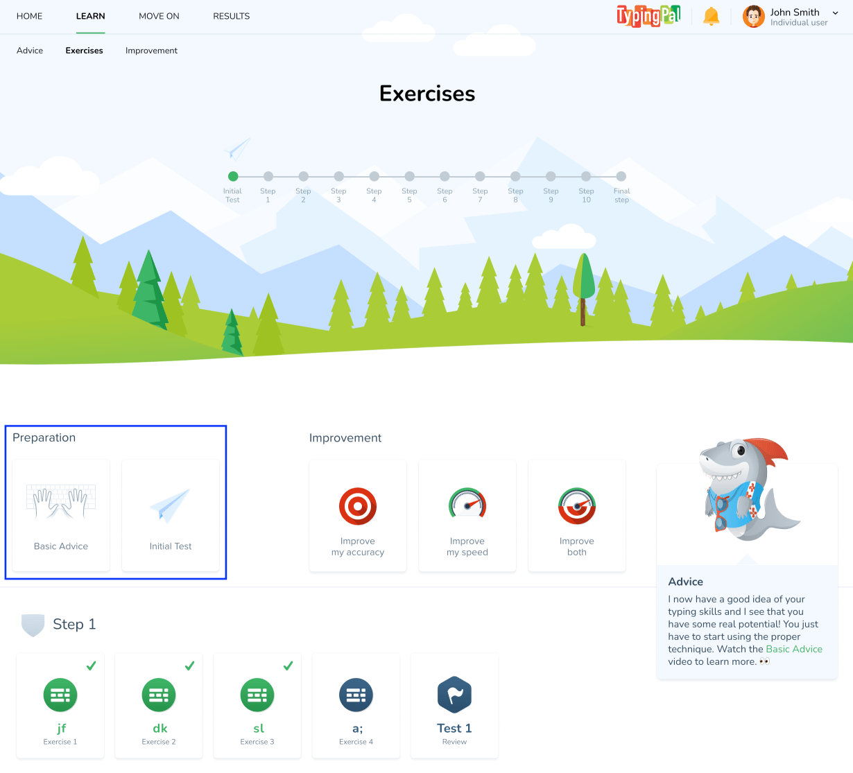However, completing the initial test is not required to begin working on other activities. If you find that your students struggle to finish the test, they can still begin their training without it—just start them on the first exercise instead.