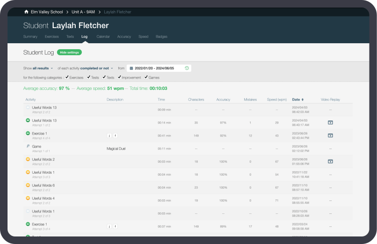 View your students’ logs to assess their performance and watch video replays to identify their strengths and weaknesses. Choose a grading system and generate report cards directly from the statistics report.