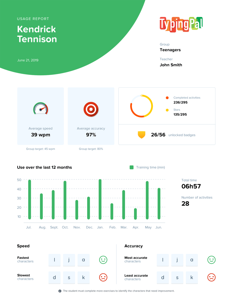 Parents are invaluable allies when it comes to encouraging students to persevere. This is why Typing Pal includes the option to generate a PDF report to provide parents with data on their child’s engagement and performance.
