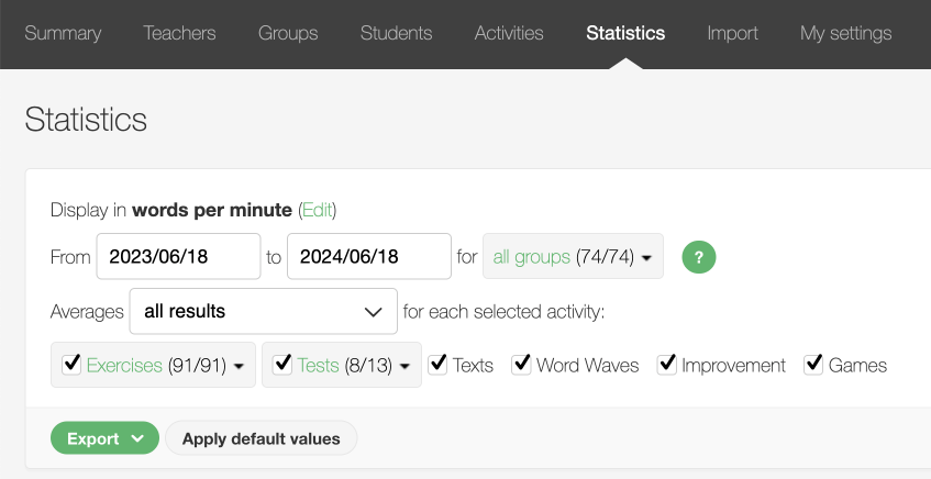 - Best result: Statistics are calculated according to the fastest time for each selected activity. If two results for the same activity show the same speed, the result with the best accuracy will be recorded. If two results for the same activity show the same speed and accuracy, the more recent result will be recorded.