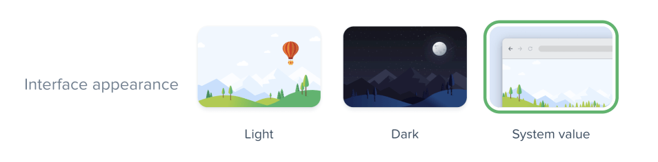 - Dark — This interface appearance uses darker colors and is recommended for work environments with poor lighting.