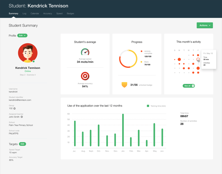 Typing Pal also allows teachers to easily share a student’s progress with their parents thanks to a specially designed PDF report. The performance indicators and attendance calendar that it contains give an idea of the student’s skill level and engagement. Parents can then encourage them to keep going and keep training regularly.