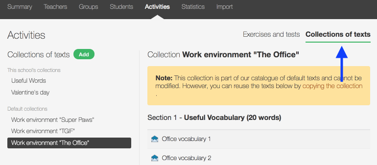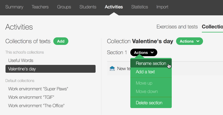 In the Activities tab, click the Collections of texts section to display the collections so that you can edit them or add a new one.