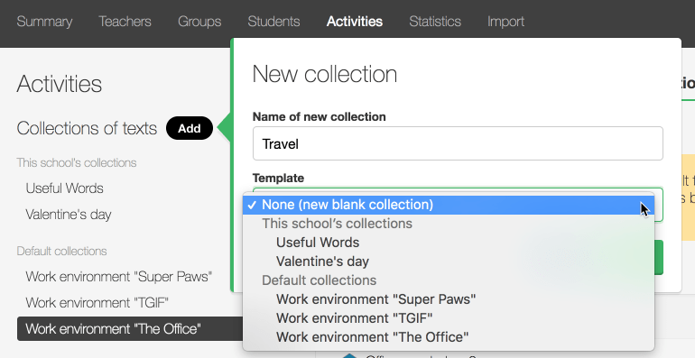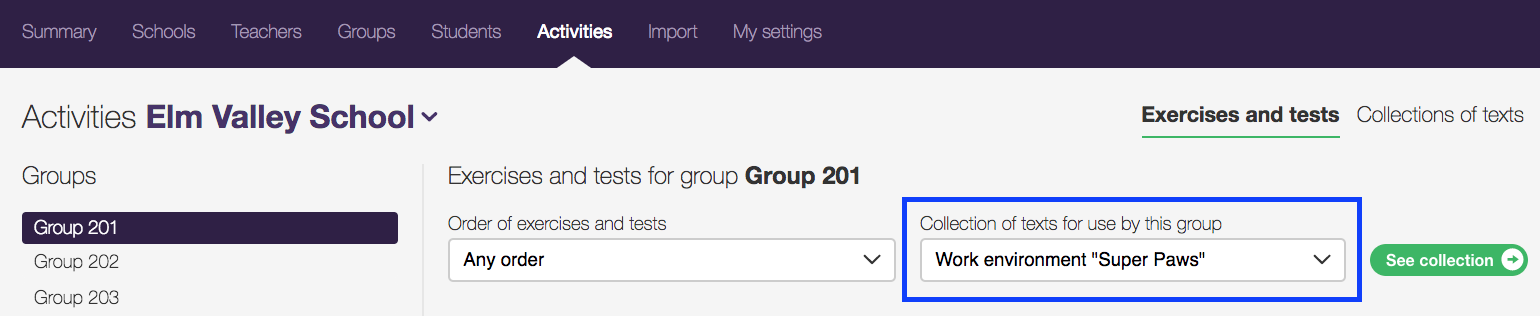 Assign a collection of texts to a group by selecting it in the menu listing all the available collections in the Activities tab.