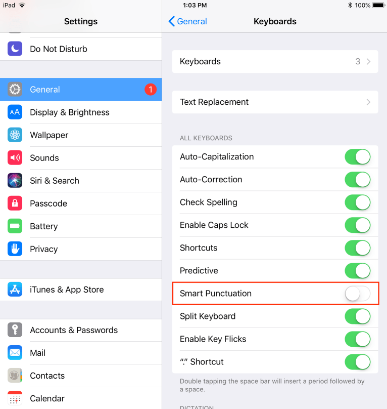 To configure the iPad, tell your students to do the following: Open Settings. Go to General > Keyboards. Deactivate the Smart Punctuation option.