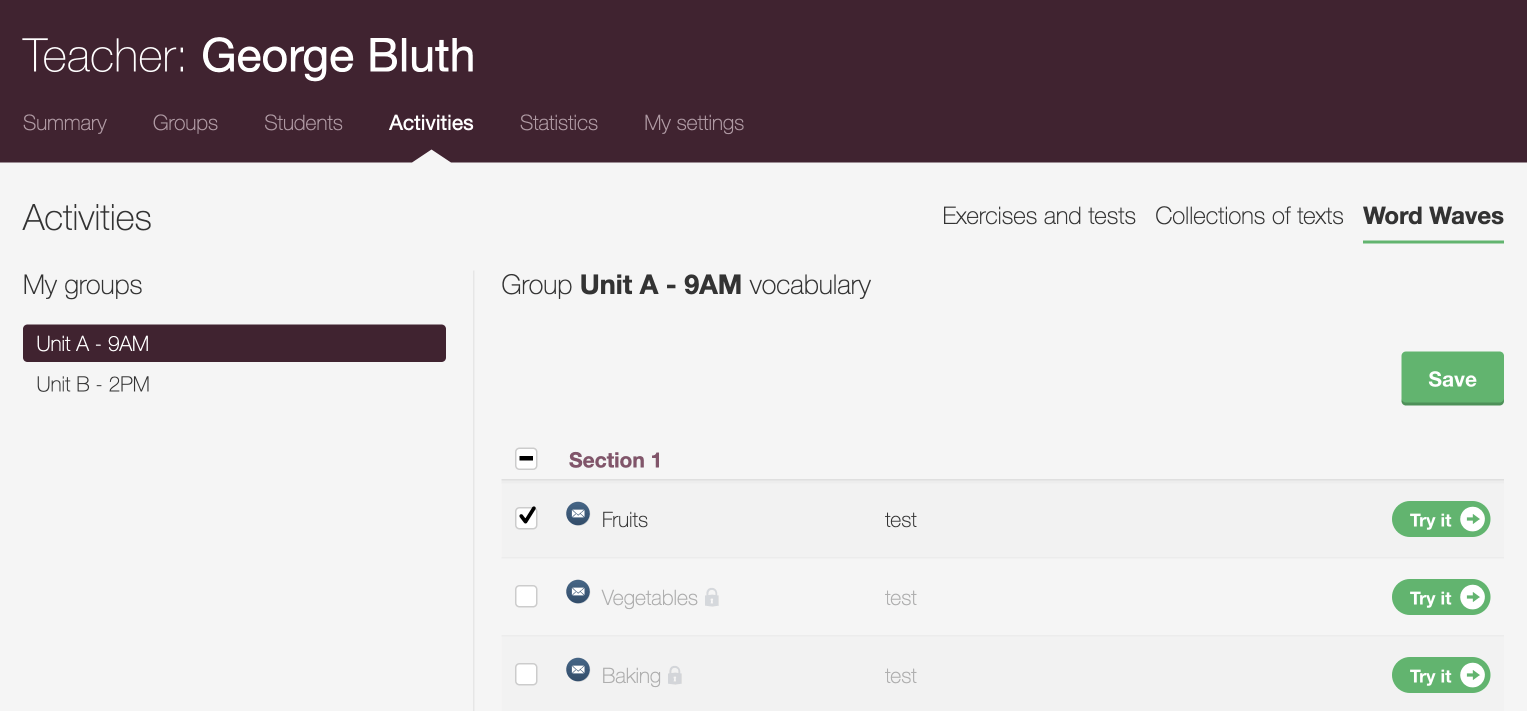 Like the practice texts, students can access all Word Waves by default. If you prefer to save them for special occasions or whenever you feel the time is right, you can block access to them from the management interface: click the Activities tab (1), then Word Waves (2), and uncheck the activities you want to lock (3).