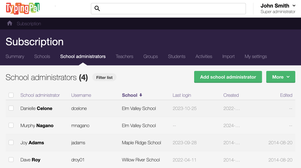 We’ve said it before, and we’ll say it again: Your feedback is invaluable to us. The proof? Once more we’ve acted on input from educators and school staff to make a much-requested improvement to Typing Pal’s management structure. The super administrator (the person who manages the subscription) can now assign multiple school administrators to share the responsibility of managing the platform for a single school!